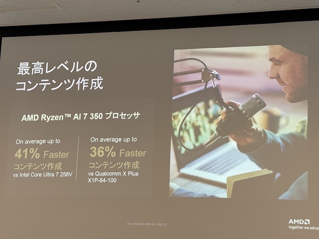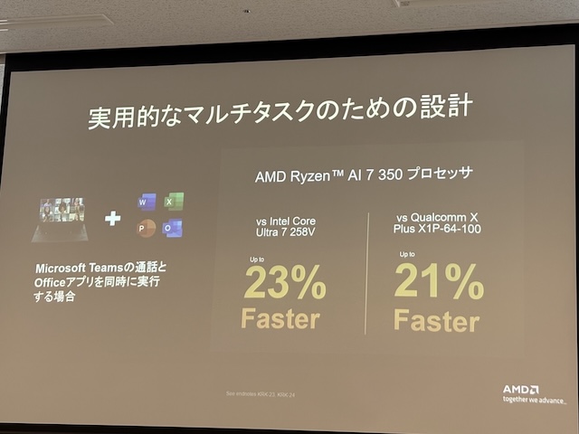 - Ryzen AI 300は、高速処理、高パフォーマンスを維持するプラットフォーム。特に、今後はAIを使いながら、Officeを使う、ゲーミングしながらAIを使うといったマルチスレッドの性能に重きを置いているそう。